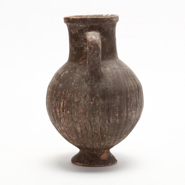 Cypro-Geometric Wheel-Made Black Slip Ware Vessel, circa 850-750 B.C., two vertical handles, the body with vertical grooves, the whole resting upon a short pedestal base.