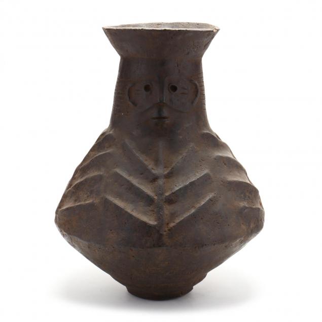 20th century, Democratic Republic of Congo, Luba People, circular form, figurative pottery vessel, "waisted form," double-faced with lower spout.
