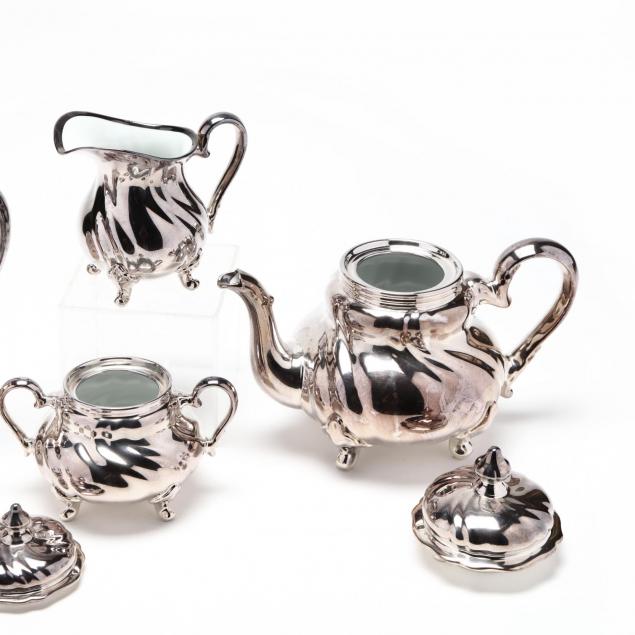 Early 20th century, silver over porcelain, to include a coffee pot, a tea pot, a creamer, and a sugar, signed "Feinsilber Auflage 1000/000."