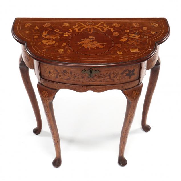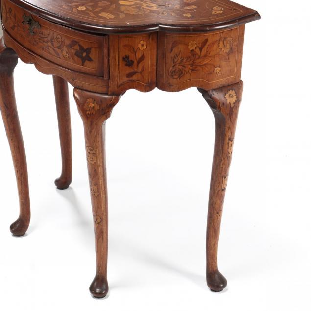Mid-19th century, mahogany, mahogany veneer, oak secondary, shaped molded top, above a single cock beaded drawer, four tall cabriole legs with pad feet, allover figural floral and avian inlays.