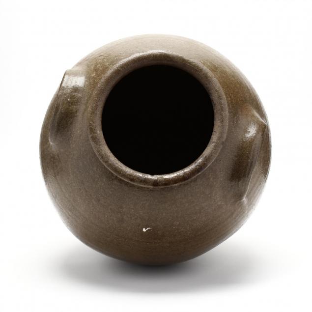 19th century, four or five gallon capacity, alkaline glazed stoneware, having a narrow rim, ovoid body, wide lug handles, unmarked.