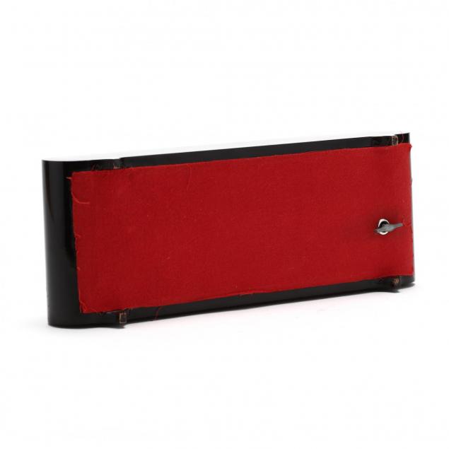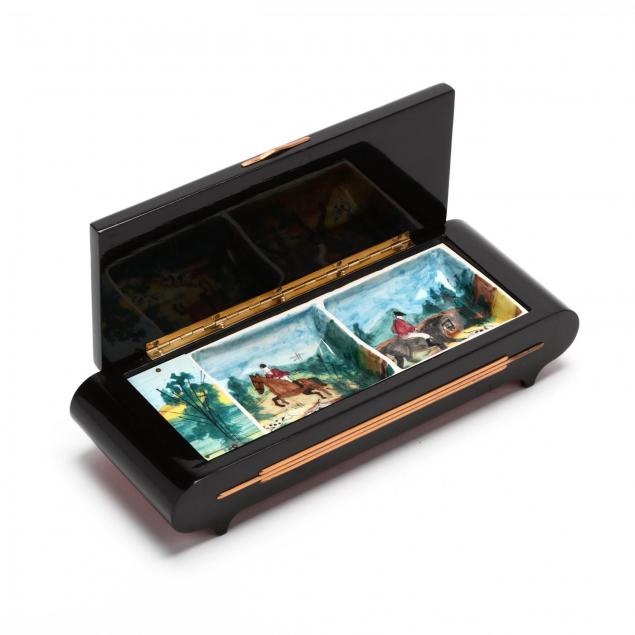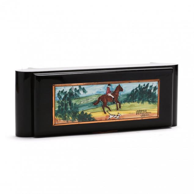 Italian, 1960s for Ceramica, black lacquered wood case with inset hand painted porcelain plaques featuring fox hunters, signed on lid, with working musical mechanism.