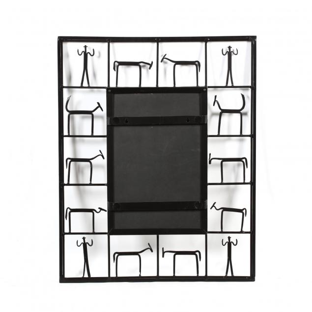 Mid 20th century, black painted iron with figures and animals throughout, unmarked.