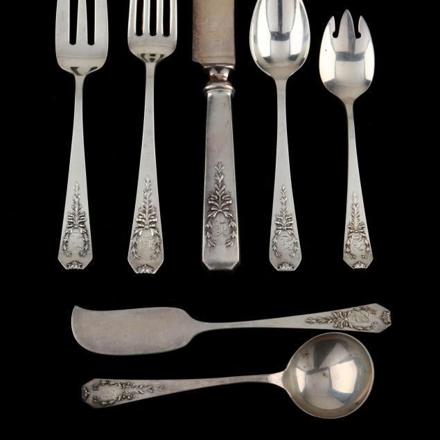 (44) pieces including: (5) knives (8 7/8 in.); (3) forks (6.75 in.); (11) salad forks; (6) bouillon spoons; (6) ice cream spoons; (5) teaspoons; (6) butter spreaders; and (2) tablespoons. Period "B" monogram.