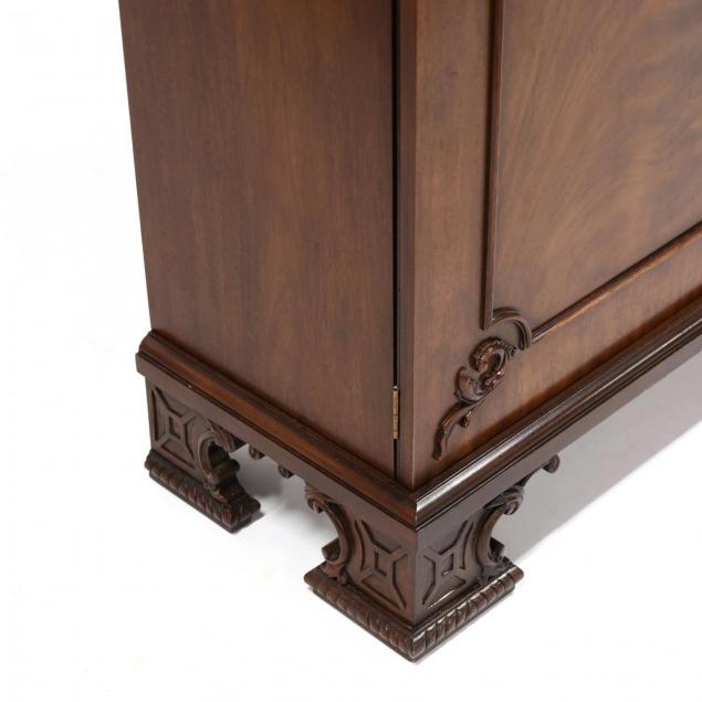 Late 20th century, mahogany, two-part form, reticulated and carved pediment, upper case with hinged glazed doors with astragal molding, mirrored and louvered shelf interior, with gadrooned edge, lower case with fretwork frieze over two hinged panel doors, raised on carved and fretwork paneled feet.
