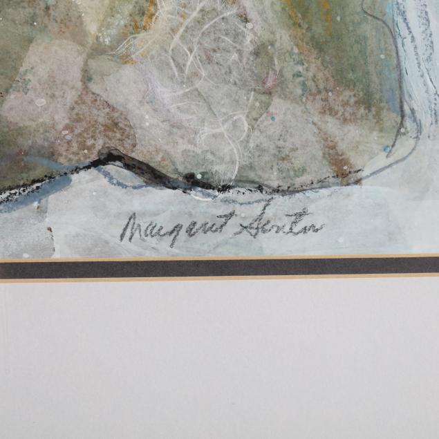 20th century, the first: Margaret Senter (NC, 1922-2009), with elements of paint, charcoal, textile, and handmade paper, signed at lower right, matted and framed; the second: Pam Stevens (NC),