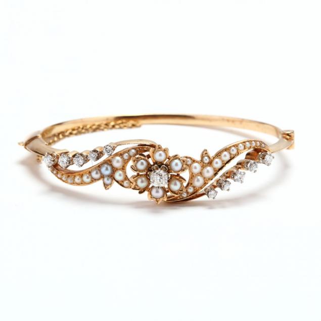 The antique style bracelet in a hinged, scrolled and floral motif centering on one prong set old mine cut diamond weighing approximately .34 carat (H color, VS2 clarity) with pearl set petals, the scrolled elements set with graduating seed pearls and with ten prong set round brilliant and old European cut diamond accents for a total weight of approximately .61 carats (H-I color, VS-I clarity), finished with an integrated clasp and safety chain, stamped 14KT.