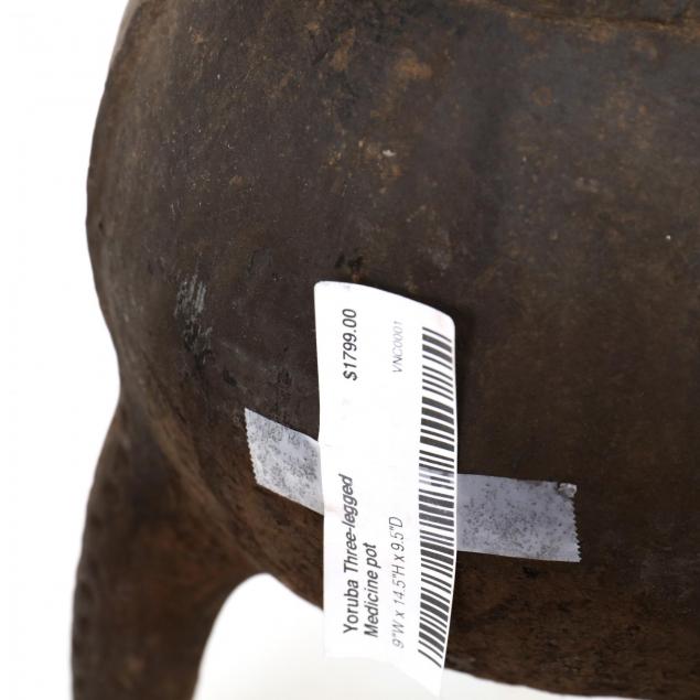 20th century, African medicine pots with incised geometric rims supported on three curved "elephant tusk" legs. The pots are a staple in the Yoruba community and are used for cooking over an open flame.