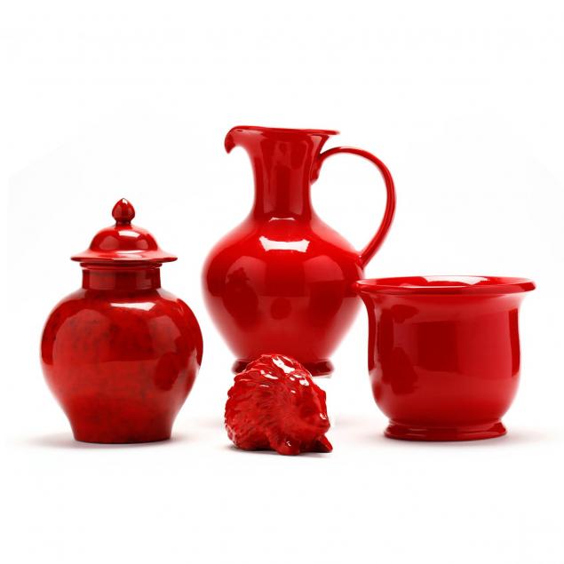 Made in Italy, a bulbous vase, Atomic Red glaze; a hedgehog (small flake); a tall pitcher; a footed urn, all marked; three baluster vases, attributed to Raynor. seven pieces total.