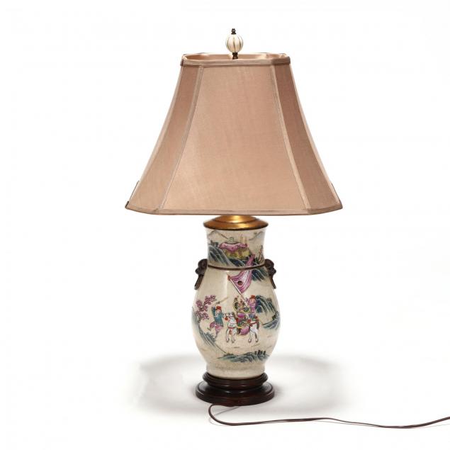 First half 20th century porcelain vase with battle scene, foo lion mask handles with crazed glaze on wood plinth.