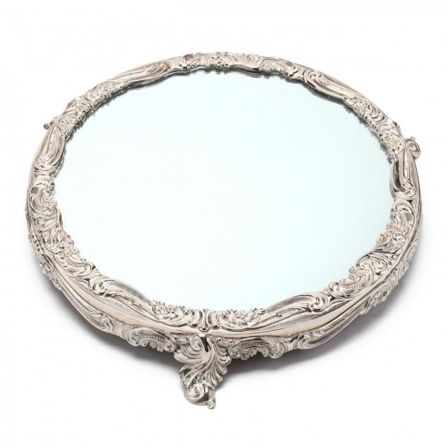 The pitcher with mark of Reed & Barton, late 19th century, model 2020, featuring playful putti decorative motif, period monogram "ECB" (15 in.) (some wear to plating); the mirrored plateau is late 20th century, mark of Wallace (1.5 x 12 in. diameter) (good estate condition).