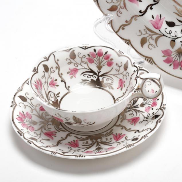 Pink and silver on bone china, to include: nine dinner plates (11 in.); eight plates (8.25 in.); eight cups and eight saucers; eight demitasse cups and eight saucers. (49) pieces total.