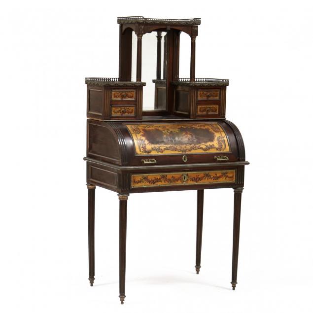 Early 20th century, two part form, mahogany, three upper shelves with reticulated brass gallery, having a central beveled mirror, flanked by four drawers with floral painted decoration, over a C scroll desk with classically paint decorated lid, pull-out writing surface with blue fabric liner, divided and drawered interior, over a long drawer with painted floral swags, raised on tall fluted legs.