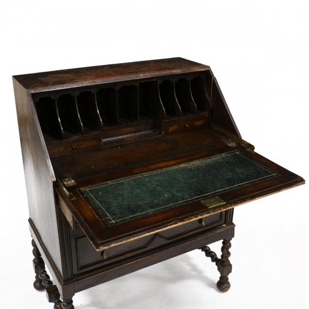 Circa 1900, oak, molded slant lid with geometric panel, interior with leather writing surface, drawered and divided compartments, over two geometric paneled drawers, raised on a barley twist stretcher base.