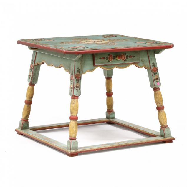 Mid 20th century, including a square table with single drawer, turned splayed legs, with one armchair and three sides, all with original painted floral decoration.