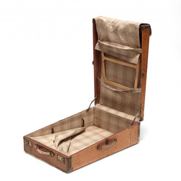 Circa 1940, the larger a striped canvas suit case with a decal for the University of North Carolina with a fitted interior; the second a leather suit case with Duke University decal with fabric lined interior.