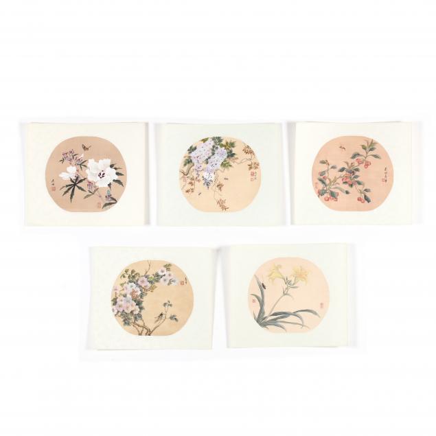Ink and colors on silk, some signed Yun Nantian (Shouping) (Chinese, 1633-1690) and some with red artist's seal, probably 20th century copies in the style of Yun Nantian, each painting focuses on a seasonal flower with insects, set with floral silk mat and backed with paper, presented unframed, a beautiful grouping.