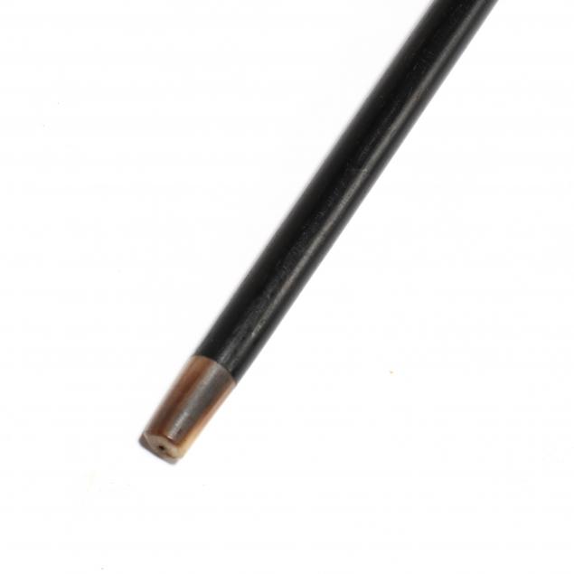 The knob of this cane is the seed of a palm tree, partially carved and tinted as a medieval man, brass collar, ebonized shaft, horn ferrule.