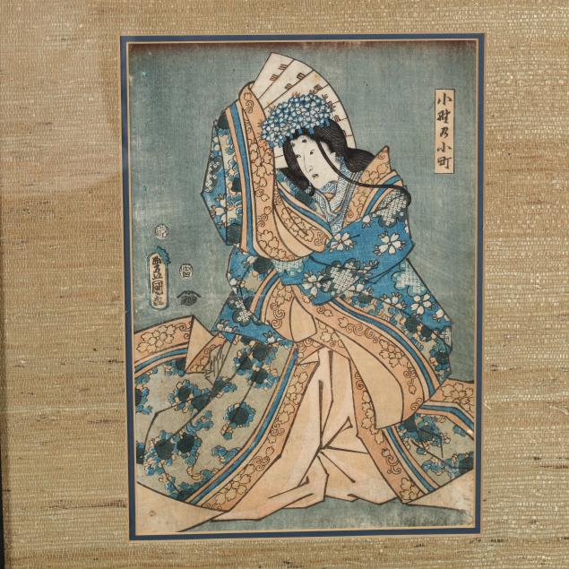 right panel from the triptych by Kunisada dPrince Genji and Abalone Divers at Futami-ga-ura, 1857, and a print of a noble lady wrapped in layers of floral pattern robes, wearing a floral headpiece and holding above her head a fan with genjimon on it, framed identically with Chinese style brass hanger at top, grass style mat, under glass, not examined outside of the frame.