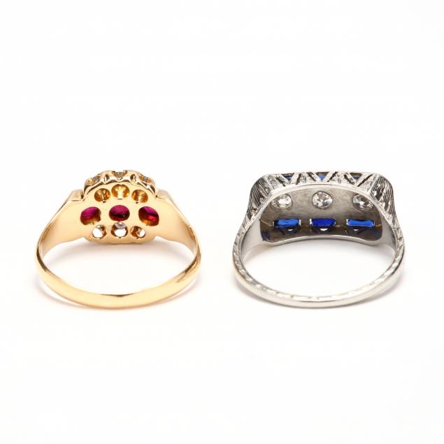 The first designed with a white gold engraved and filigree mount set to the front with three bead set old European cut diamonds weighing approximately .30 total carat (G-H color, VS-I clarity) and with French cut synthetic blue sapphire accents, stamped 18KT (ring size 6); the second designed in yellow gold and set to the front with three oval faceted rubies and with old European and transitional cut diamond accents weighing approximately .16 total carat, stamped for 18KT and with British hallmark (ring size 6).