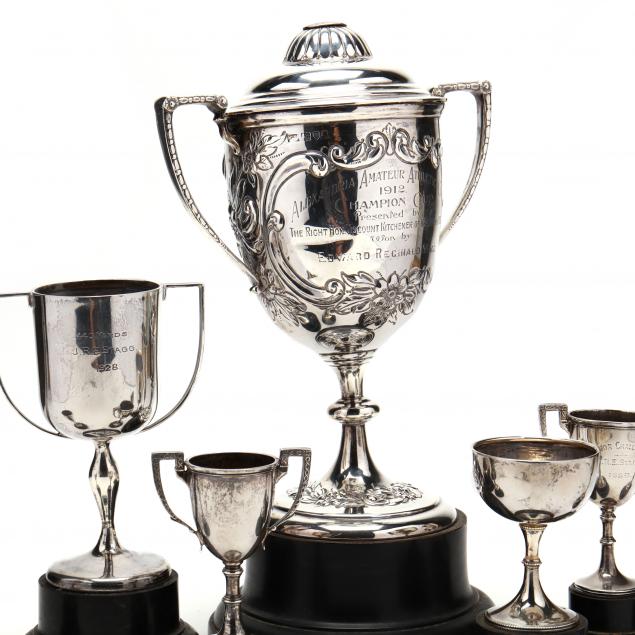 The first a large trophy with mark of Mappin & Webb, London (1911) hallmarks, engraved "Alexandria Amateur Athletic Club / 1912 / Champion Cub / Presented by / The Right Hon. Viscount Kitchener of Khartoum, K.P., G.C.B. O.M. / Won by / Edward Reginald Stagg," presented atop an ebonized hardwood base (Trophy 10.5 in.) (the figural finial detached but present, minor denting); one with mark of Henry Williamson, Birmingham (1927), engraved "400 Yards / J. R. E. Stagg / 1928," with hardwood stand (6 in.); one with mark of Charles Stuart Harris, London (1928) hallmarks, engraved "Cyril Batchler / J. R. E. Stagg / 1929," with hardwood stand (minor denting); one with mark of Charlest Stuart Harris, London (1927) hallmarks, engraved "Junior Challenge / J. R. E. Stagg / 1928," with hardwood stand featuring a button for J. B. Yabsley Silversmith of London (minor denting); one with mark of Charles Stuart Harrison, London (1929) hallmarks, no engraving, black plastic stand; a chalice with mark of S. Blanckensee & Son Ltd., Birmingham (1902), no engraving, with hardwood stand (Chalice 3 3/8 in.); and a trophy with Birmingham (1928) hallmarks, rubbed sponsor's mark, no engraving, hardwood stand (denting and mis-shaping to foot and rim).
