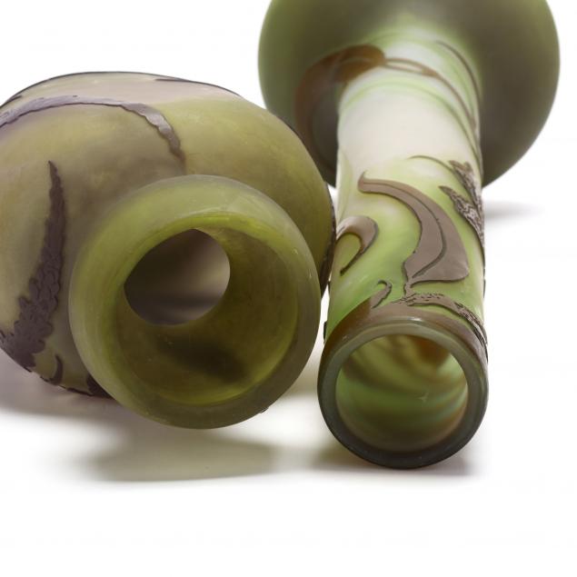Circa 1900, including a green cut to white stick vase with closed and open flowering buds, cameo signed towards base; together with a pinched double gourd style purple cut to green-white flower design vase, cameo signed at lower side; both with polished bases.