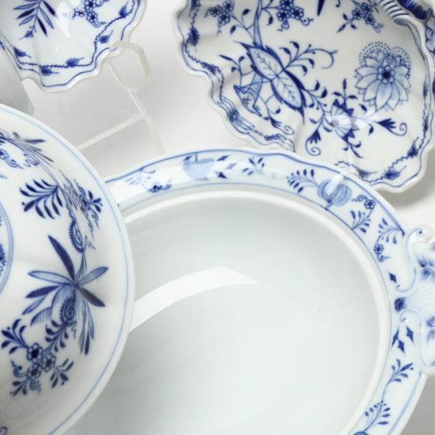 Including a pair of divided serving dishes with handles, a large lidded serving bowl (13 in.), a sauce bowl with underplate, and a square serving bowl; each marked to base, one shell dish marked as a second.