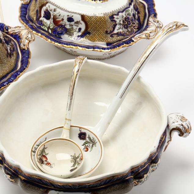 To include: four lidded serving dishes, two ladles, three platters (largest 20 in.); twelve plates (10.25 in.); twelve soups; twelve plates (9.25 in.); open sugar and creamer with under plates; twelve plates (8 in.); twelve plates (7 in.); eight cups; (13) saucers of two different sizes.