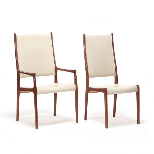 1960s, teak, cream naugahyde upholstery, two armchairs and four side chairs, with Danish Furniture control label.