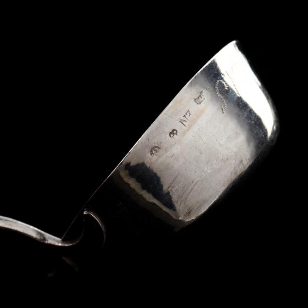 Hallmarked to outside of shaped bowl, pricked work monogram "AAS," turned hardwood handle with ebonized finish.