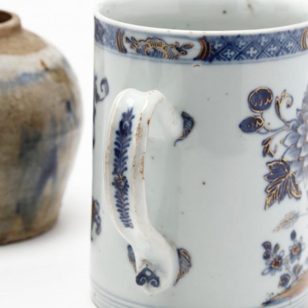Includes five items: an extra large Chinese Export mug decorated with peonies and rocks in cobalt blue (chips to handle), a ginger jar with blue and white wash (with brown substance down some sides), a Vietnamese bowl (fretting and minor chips to rim; a few tight hairline cracks), a thinly potted teapot with bluish celadon glaze and cobalt blue decoration of a village (lacking cover; some hairline cracks; possibly restored by handle), and a small tea bowl (hairline cracks.)