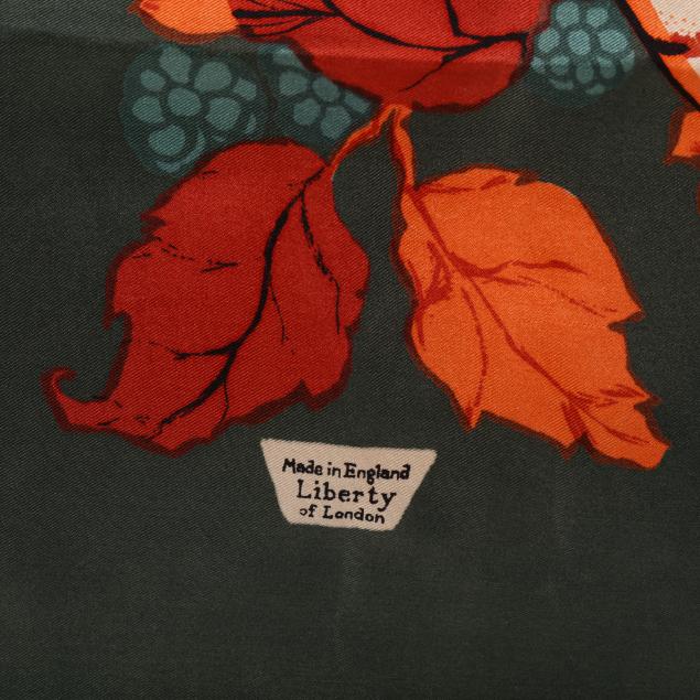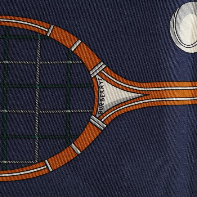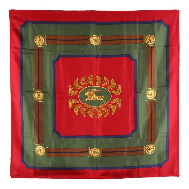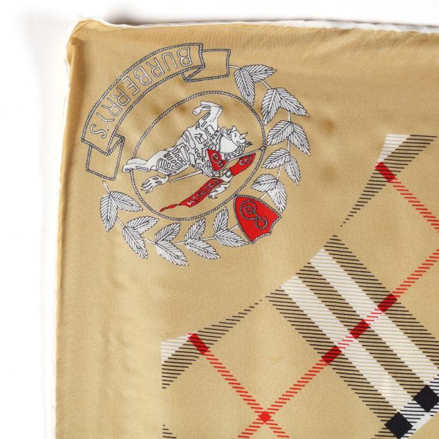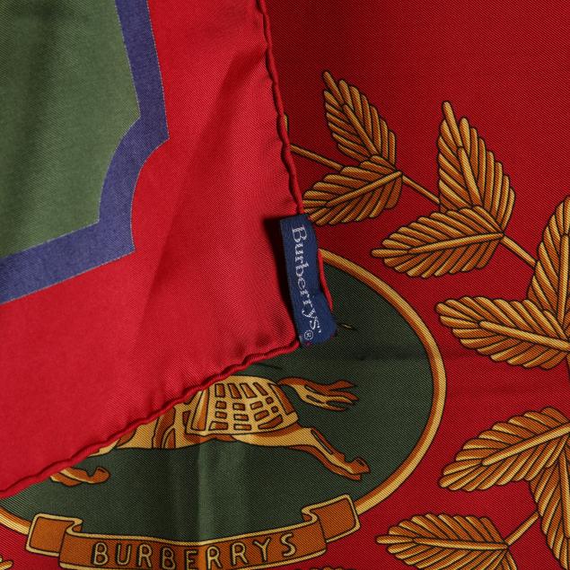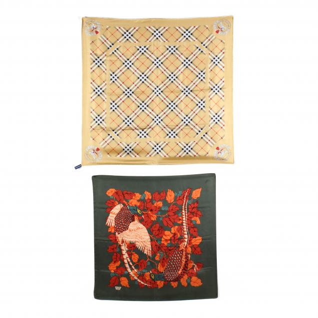 Three by Burberry, a traditional plaid, a red and green centered with a mounted knight, and the third is blue with a tennis / golf motif; the fourth scarf is a Liberty having a decor of pheasants and autumn foliage (27 x 27 in.)