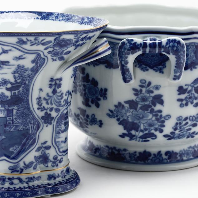 Late 20th century, including a Historic Charleston Reproduction double handled tapered jardiniere with gilt rim; and a Metropolitan Museum of Art double handled circular jardiniere with floral sprays, both marked.