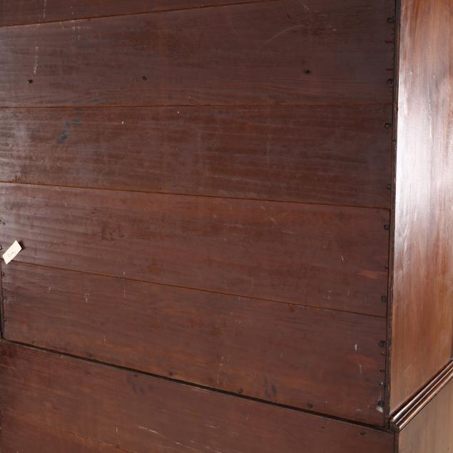 Right rear side foot facing later; later drawer pulls with patches to original bale and rosette pull holes; later paint to upper interior; one drawer runner rebuilt; later hinges; missing locks; later escutcheons.