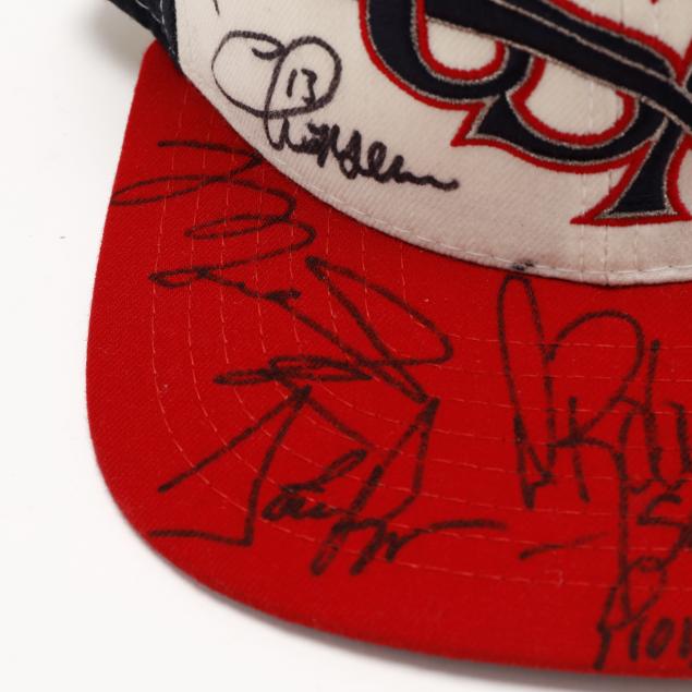 Hand-signed by members of the 1992 Olympic team, including Jordan, Drexler, Pippen. New Era cap.