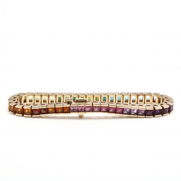 The line bracelet designed with channel set multi-colored square cut gemstones to include blue topaz, peridot, citrine, and amethyst, stamped 14K.
