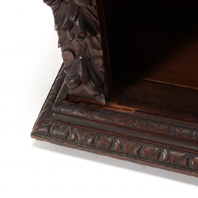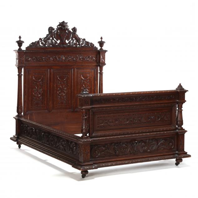1870s, three pieces including a marble top washstand, marble top with applied backsplash supporting a towel bar with acorn finial, single long drawer above a single cabinet door, featuring a central lion's head, raised paneled sides, allover relief carving with dolphins, fruit and foliate designs, on casters (expected light wear to marble top; wood chip and loss to lower left corner below door); a dresser featuring a mirrored support with turned and fluted columns, rectangular beveled mirror with relief carved lion head pierced and scrolled crest, the dresser with four graduated long drawers each with relief carved stylized bellflower carving flanked by fully turned fluted tapered columns, raised panel sides, suppressed bun feet (wear, surface loss, and shrinkage cracks to top; small molding loss to left lower side of mirror support; escutcheons with wear and minor losses as drawers open by pulling key at escutcheon; lacking key; these drawers were built and designed not to have knobs and have never had knobs; bottom drawer missing lock); and a full-size high back relief carved bed, triple paneled headboard with an applied crest featuring two rampant lions flanked by carved finials with acorn, well developed relief carved footboard and side rails, on casters (appears to be in good estate condition).