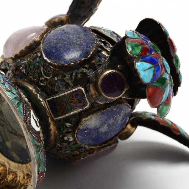 Early 20th century, the reticulated body with bezel set lapis and amethyst cabochons, the removable cover with bezel set lapis surrounded by synthetic rubies and enameled border incorporating masks alternating with floral and swag design, this enamel motif repeated on the domed base, the wings, tail feathers, and elongated neck with multi-colored enameled surfaces, the head with two diamond eyes and an amethyst cabochon to crest, marked with French swan import mark to inner edge of cover.