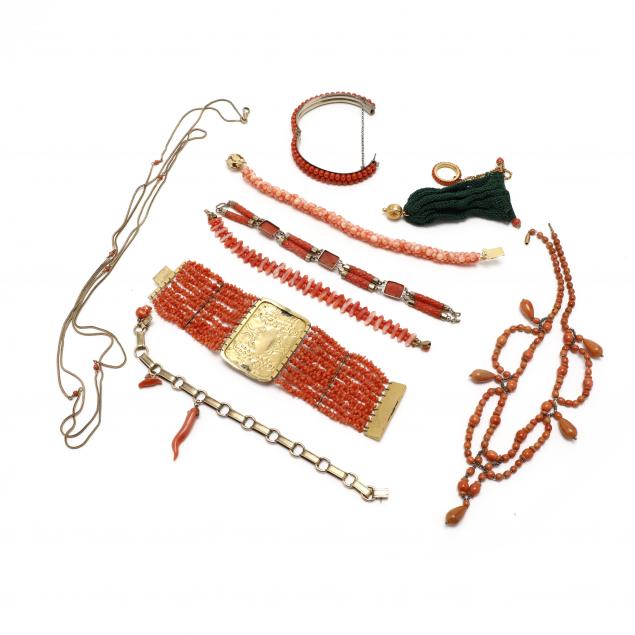 A woven coral bead necklace with a gold tone flower motif clasp (8 in.); a coral fence motif bracelet with a gold tone clasp (7 in.); a double strand carved coral link bracelet set in gold tone metal (7.5 in.); an alternating round and detailed oval link bracelet with three carved coral charms depicting a skull, saddle, and a horn (8 in.); a wide multi-strand puzzle piece coral bracelet with a central gold tone plaque stamped with floral motifs and set with round and oval carved coral stones (gold tone; 7 in.); a bangle made with two rows of coral beads (tested silver, content unknown; 3/8 x 6.5 in.); a gold tone woven chain with small coral beads throughout and a hook at the bottom ( 54 in.); a swag necklace made with coral and colorless beads and a gold tone clasp (15.5 in.); and an eternity coral bead ring attached to green woven coin purse with coral and gold tone beads (gold tone; Ring Size 3.