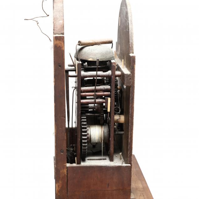 Estate of the late John M. Bahner, Jr., Albemarle, NC Finials likely later; separation cracks to hood at frieze; missing glass to hood door; chip and loss to right front foot; surface scraping and wear to left lower case by foot; no case key. Please See Terms and Conditions of Sale: Clocks and Watches.