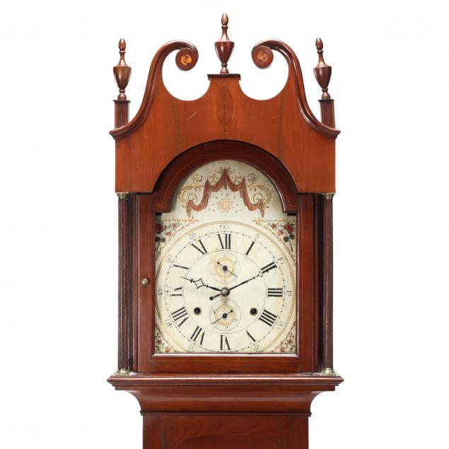 Possibly New Jersey, early 19th century, painted wood face with Roman and Arabic numerals, second hand, date hand, upper swag and floral spandrels, with wooden works, dovetailed hood with broken arch scrolled pediment with central plinth, fully turned and reeded columns, case with upper cove molding above a hinged waist door, scalloped skirt with French bracket feet, oval mahogany inlays to hood frieze, waist door and base, lightwood line inlay throughout. With pendulum, two weights and winding key.