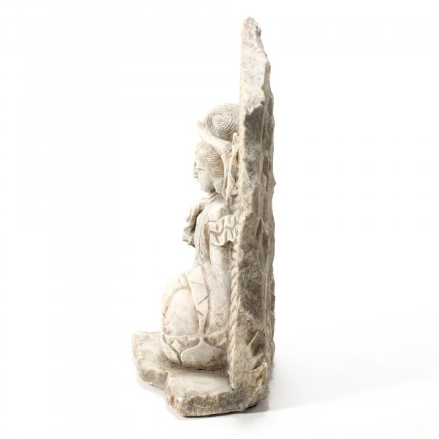 20th century, Guanyin, the Bodhisattva of Compassion, is depicted seated atop a lotus blossom base wearing jewels and a crown.