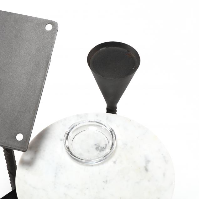 1990, painted rebar, marble and glass, one with slanted telephone holder, unmarked.