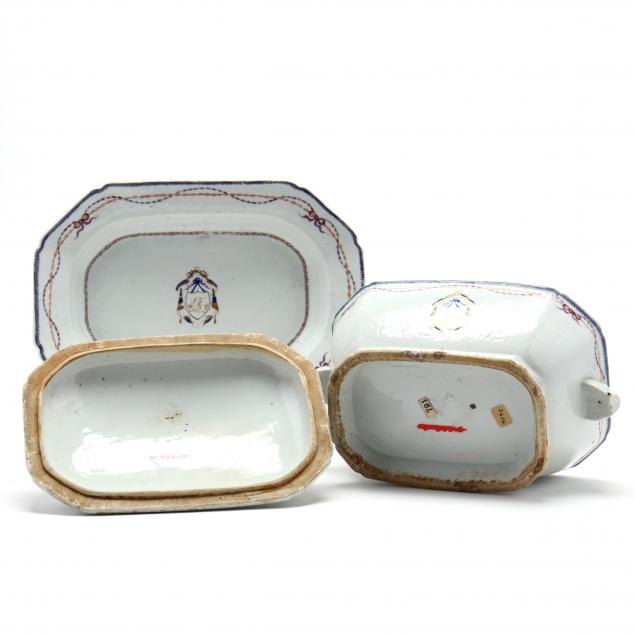 The Estate of the late Betsy J. Sykes, Raleigh, NC Loss to horns on both faux handles; some rubbing and wear to colors on both; loss to gilding on rims of both; some dark spots to under plate; roughness to edges of tureen; nick to rim of under plate.