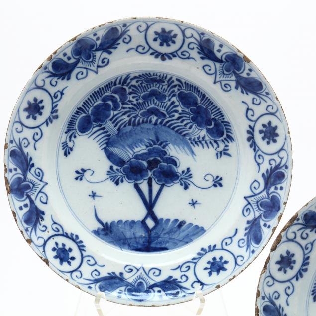 First half 18th century, blue and white decoration centered with stylized foliage raised on a triple stem, wide border, unmarked.