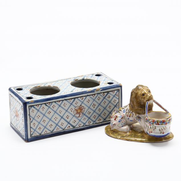 Early 19th century, a charger decorated with a flowering tree and vases on a table; a salt cellar in the form of a lion holding a basket (3 x 3.75 in.); an inkstand with wells for bottles and quills (2.25 x 2.75 in,) (chipping at most edges).