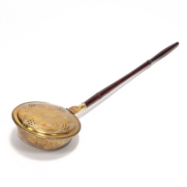 19th century, reticulated brass lid with chased decorated, turned wood handle.