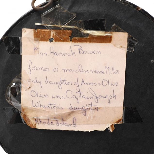 Early 19th century, each watercolor on paper and hollow cut, one with puffy sleeves and with inscription under mat identifying sitter as Aunt Elvira Cressy (laid down; with affixed mat); the second a woman with a blue ribbon in a stamped gilt metal and wood frame, purchased from Garth's Auction, date unknown (with mat burn; small loss to lower right corner); the third a half length portrait housed in a round wooden frame, with attached paper to reverse identifying sitter as "Mrs. Hannah Bowen / former or maiden name Miller / only daughter of Amos and Olive / Olive was Captain Joseph / Wheaton's daughter. / Rhode Island" (likely laid down; small tear to upper right; with breaks to frame).