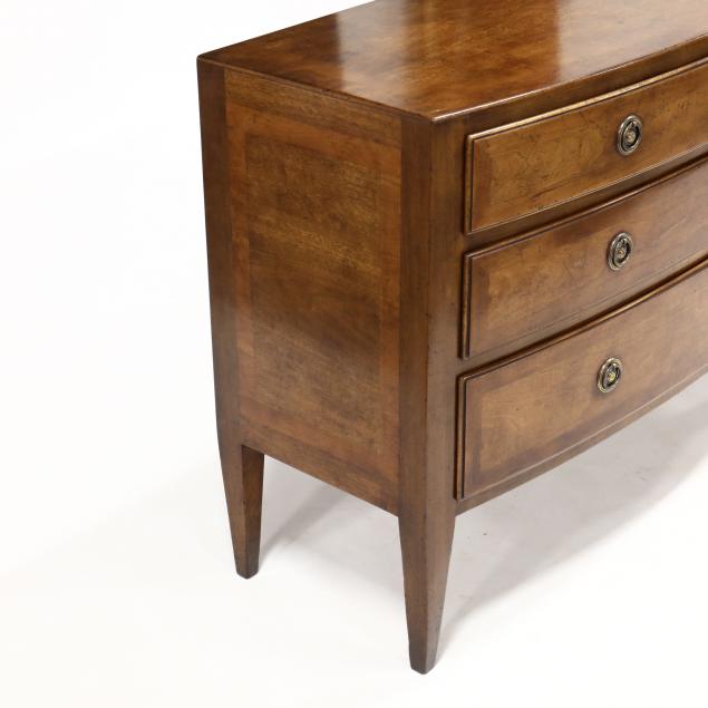 Second half of the 20th century, mahogany, bowfront top with inlaid cherry banded border, two over two lipped graduated drawers, on square tapered legs.