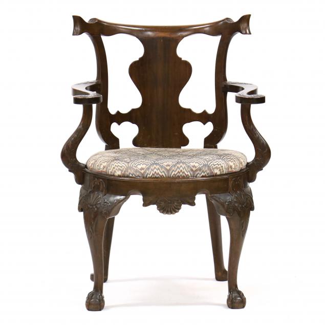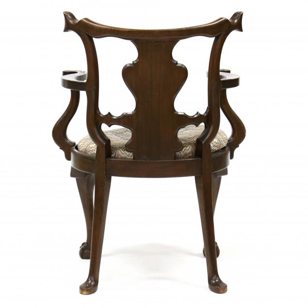 Circa 1900, mahogany, unusual oval form, shaped and carved ears, vasiform concave backsplat, shaped arms and arm supports with relief carved vine, upholstered slip seat, seatrail with carved drop shell, tall cabriole legs with relief carved shell and rosette at knee, ball and claw front feet.